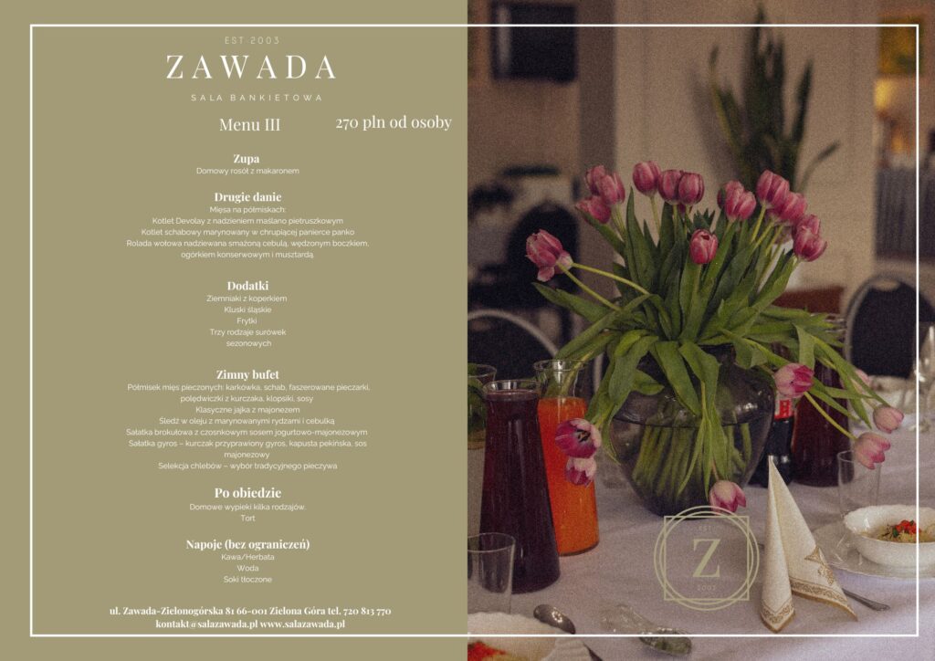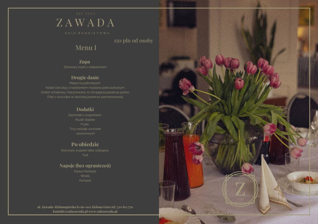 Co obejmuje oferta? Jeśli chodzi o menu i ofertę, w przypadku przyjęć chrzcielnych opieramy się na podstawowym szablonie, który stanowi punkt wyjścia do zaplanowania indywidualnego menu. Załączamy ofertę menu, która jest naszą bazą do ustalenia szczegółów. Oczywiście, podczas dokonywania szczegółowych ustaleń uwzględnimy wszystkie sugestie, wskazania dotyczące alergii oraz ewentualne ograniczenia dietetyczne. Na rok 2026 nasza podstawowa oferta obejmuje dwudaniowy obiad.