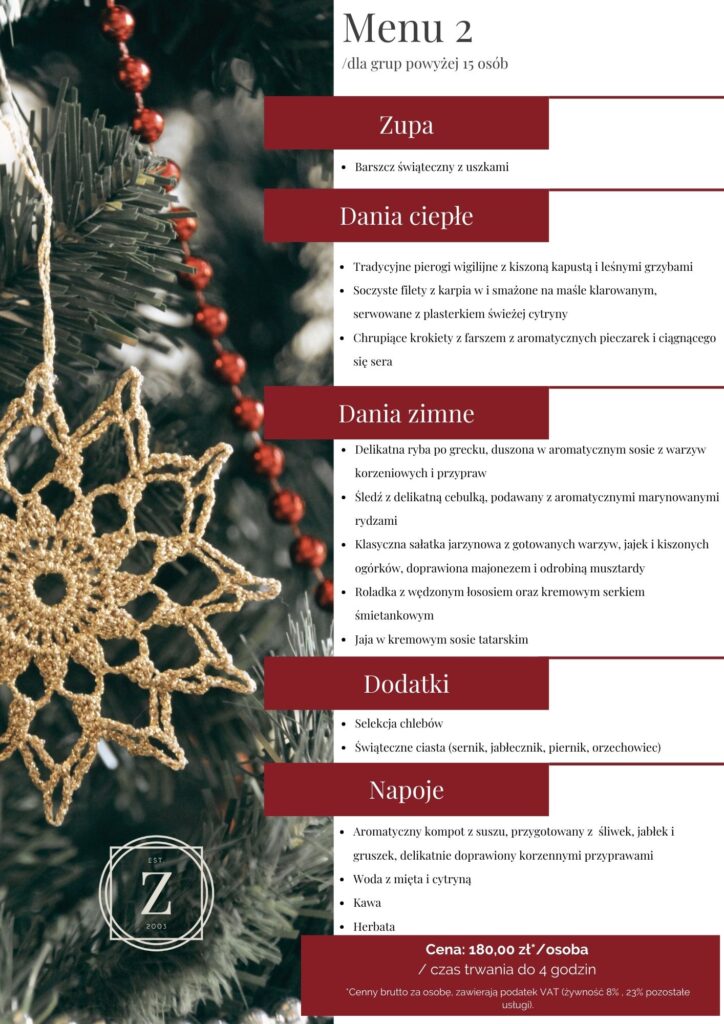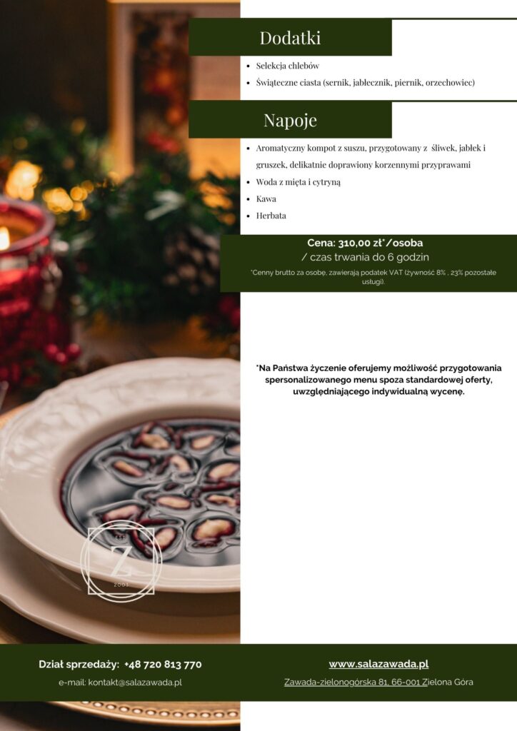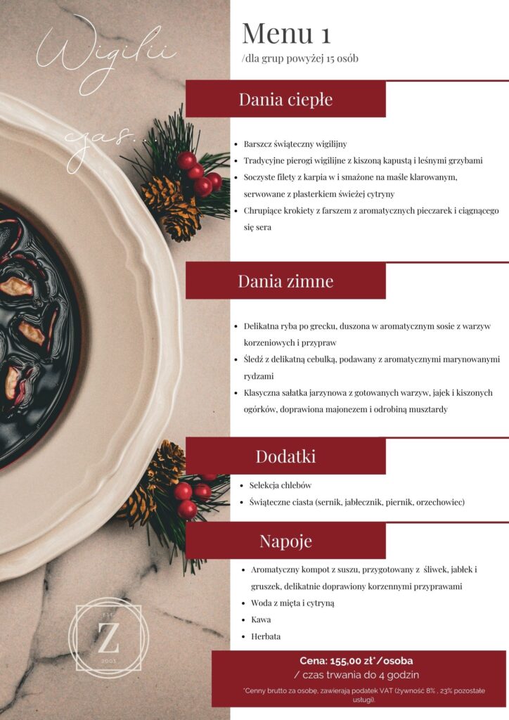 Załączamy naszą ofertę menu jako bazę do stworzenia indywidualnej propozycji, która uczyni firmową Wigilię niezapomnianą.