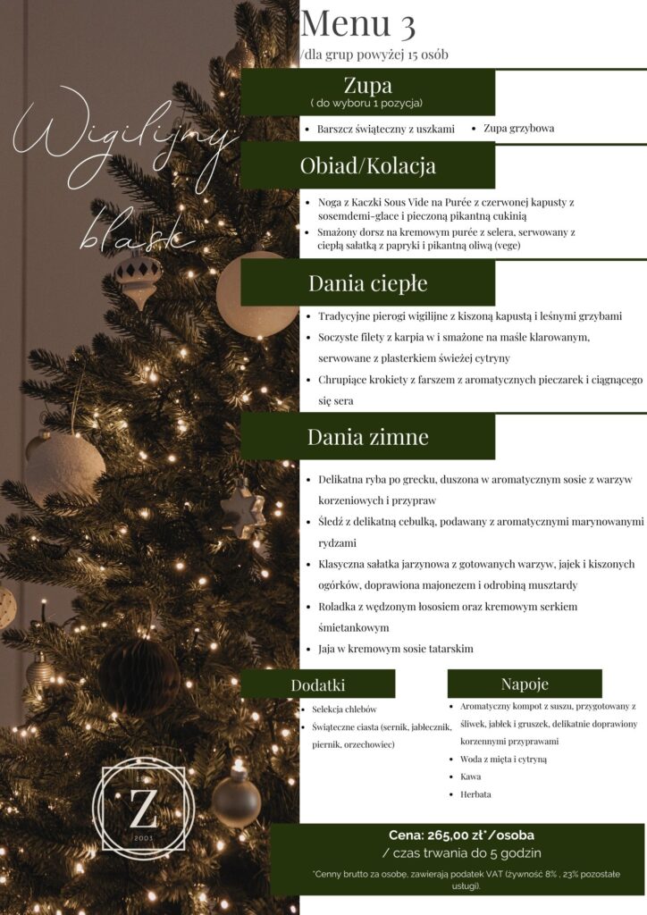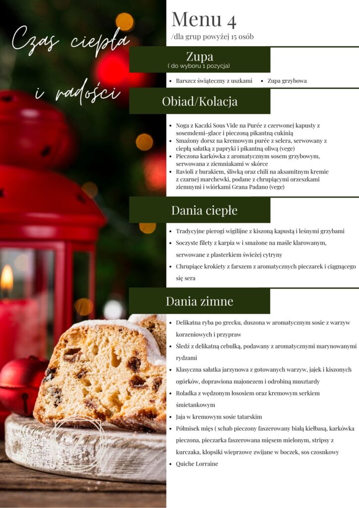 Chcemy uczynić ten czas wyjątkowym, zapewniając niezapomniane kulinarne doznania. Serdecznie zapraszamy do skorzystania z naszej oferty, aby w eleganckim otoczeniu celebrować świąteczne chwile i dzielić się wzruszającymi wspomnieniami.